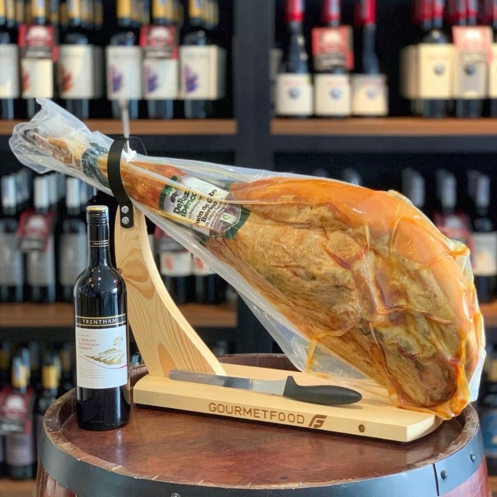 Quà Tết đùi heo muối Iberico nguyên khối trên giá gỗ kèm vang đỏ tạo ấn tượng mạnh, giúp nâng tầm tiếp khách và lời tri ân.