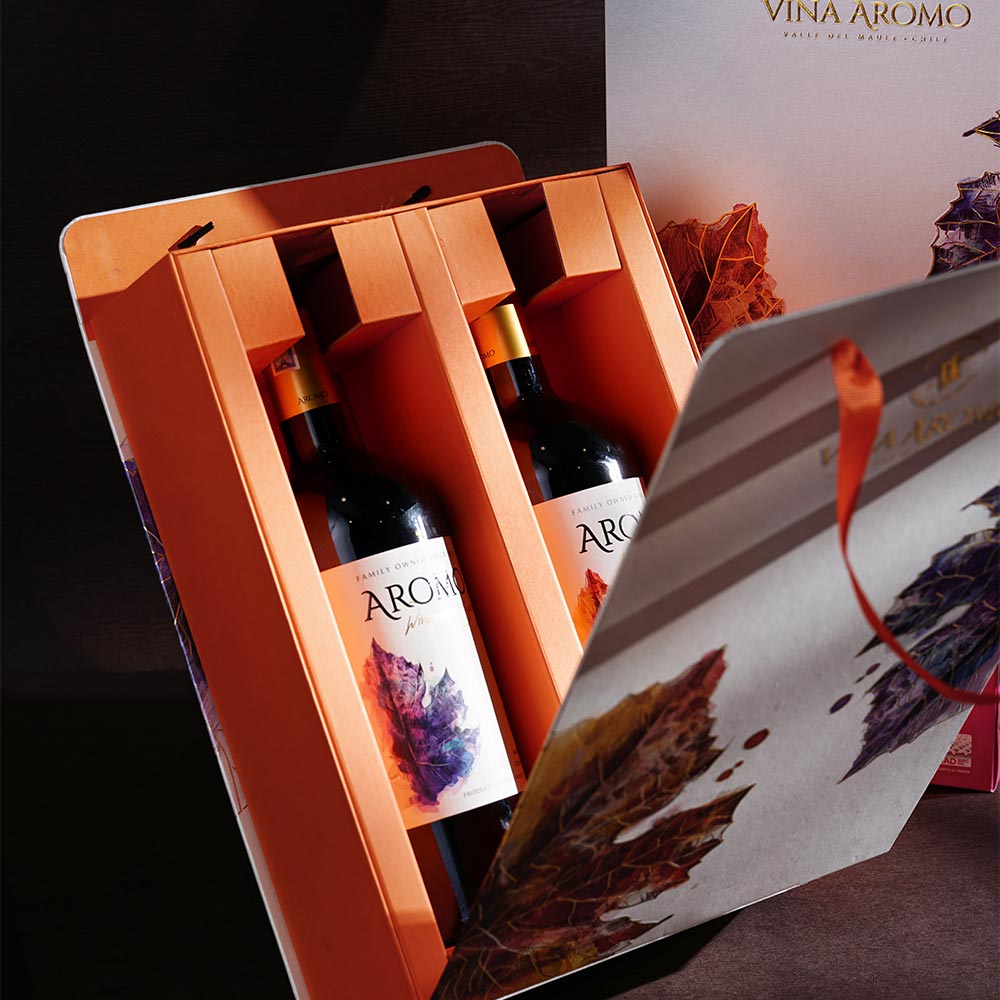 Hộp quà đôi rượu vang với thiết kế độc đáo bởi hai chiếc lá nho màu tím và đỏ. Được lấy từ cảm hứng của các nhãn chai rượu vang hảo hạng của nhà Viña Aromo. Sự kết hợp giữa hai tông màu với sức sống mãnh liệt, tràn đầy năng lượng tích cực cho một sự khởi đầu mới. Hộp quà tượng trưng cho một lời chúc chân thành mà người tặng gửi tới người nhận. Đặc biệt, mỗi chai rượu vang trong hộp đều mang lại một trải nghiệm ẩm thực độc đáo, phù hợp cho các bữa tiệc, dịp lễ hoặc quà biếu tặng.